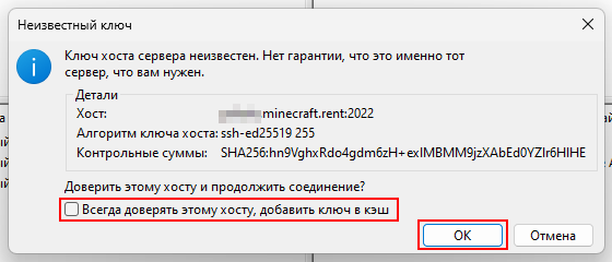- В появившемся окне поставьте галочку на “Всегда доверять этому хосту, добавить ключ в кэш” и нажмите “ОК”.