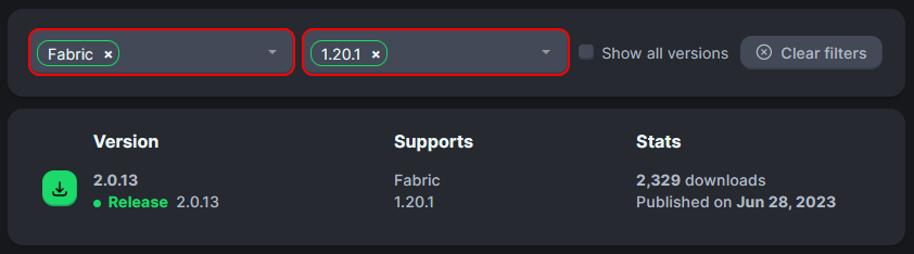 - Скачайте плагин MiniMOTD для нужного вам загрузчика нужной вам версии. Так как в примере будет использован Fabric c Minecraft 1.20.1, я выставляю соответствующие фильтры: