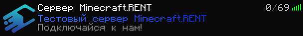 main.confи изменить следующие параметры:iconнаminecraftrent. Формат файла (.png) не указывается.line1на<gradient:#346eeb:#142acc>Тестовый сервер Minecraft.RENT. Тег<gradient:#346eeb:#142acc>задаёт тексту градиент из двух HEX цветов.line2наПодключайся к нам!.