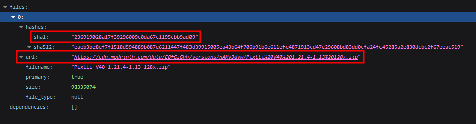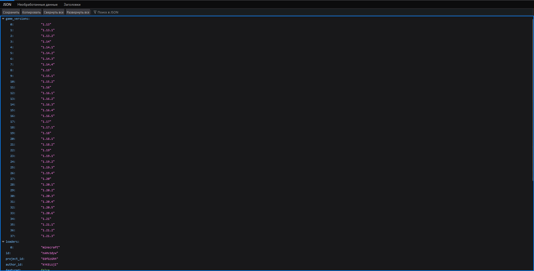 https://api.modrinth.com/v2/version/<ID версии>. Должно получиться примерно вот так: https://api.modrinth.com/v2/version/nAMv3dyw - Откройте эту ссылку в браузере. Вас встретит JSON файл. Не пугайтесь, мы просто возьмём данные и уйдём.