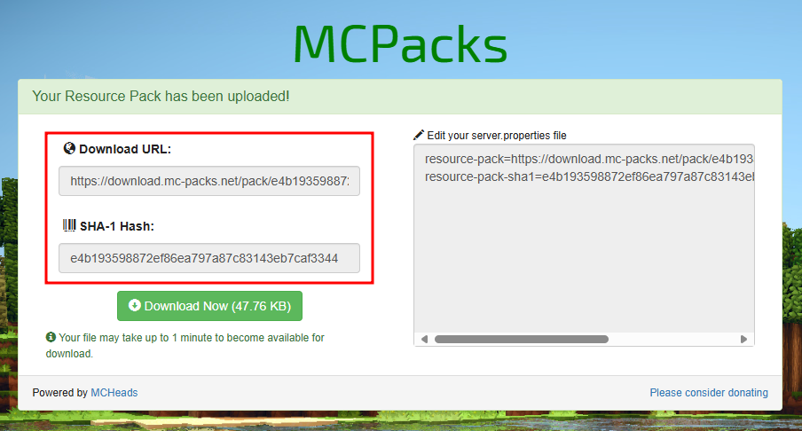 resource-packзадайте значение из “Download URL”, полученное выше. В моём случае -https://download.mc-packs.net/pack/e4b193598872ef86ea797a87c83143eb7caf3344.zip - Параметру