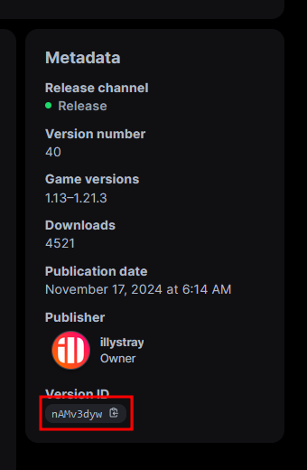 - Скопируйте ID версии. Находится он в панели “Metadata”, в самом низу. Просто нажмите на неё, чтобы скопировать.